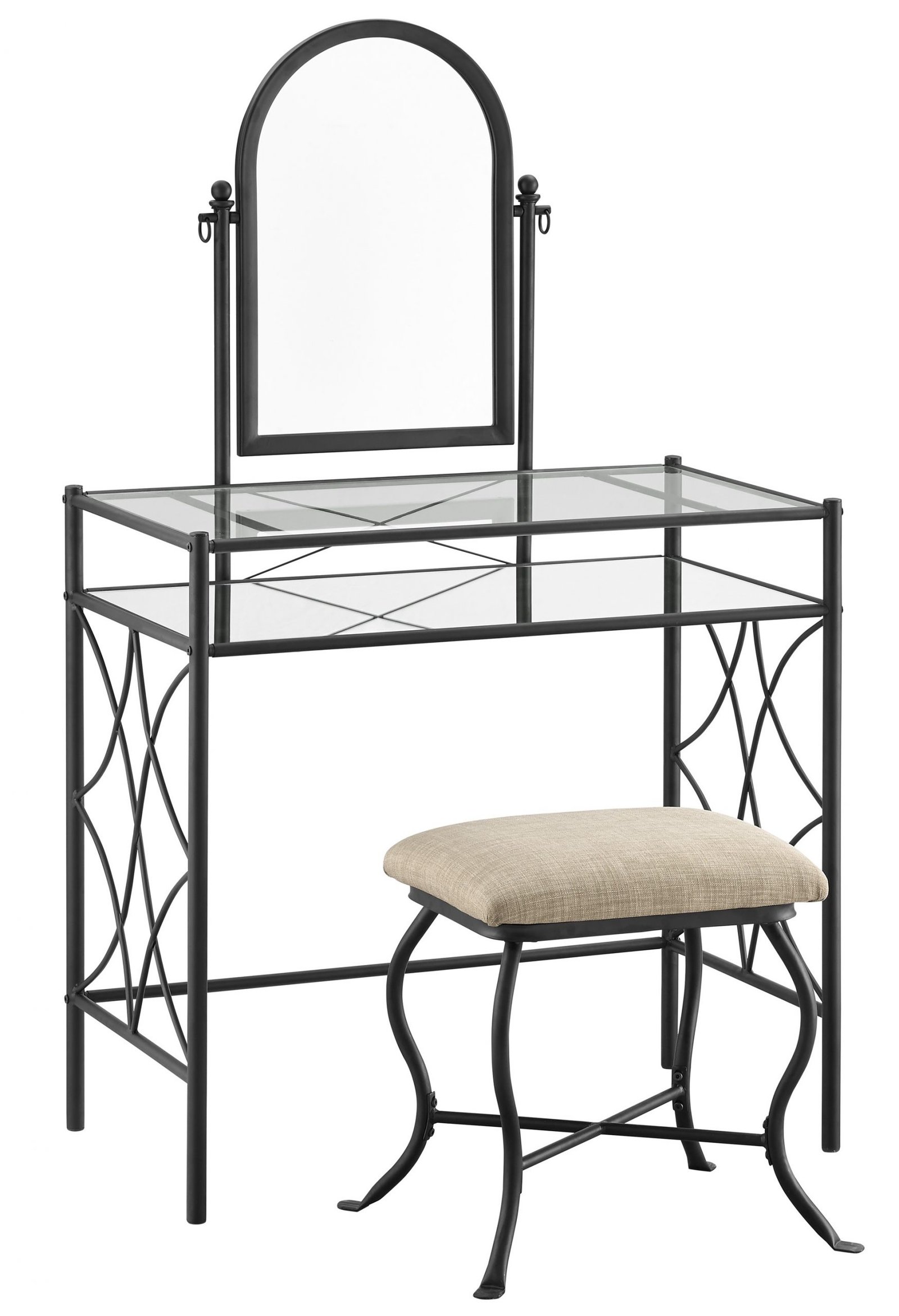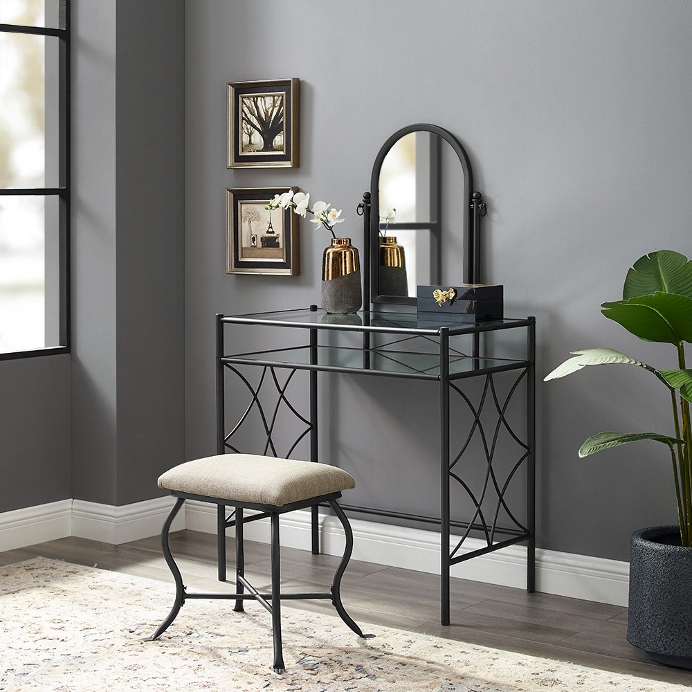 - Includes one (1) metal vanity with mirror and one (1) upholstered vanity stool