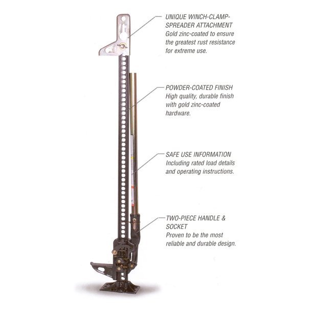 This Hi-Lift Jack Xtreme mechanical Jack is used to lift up to 60 inch and has a capacity of 4,600 pound. It is made of cast iron and comes in charcoal.