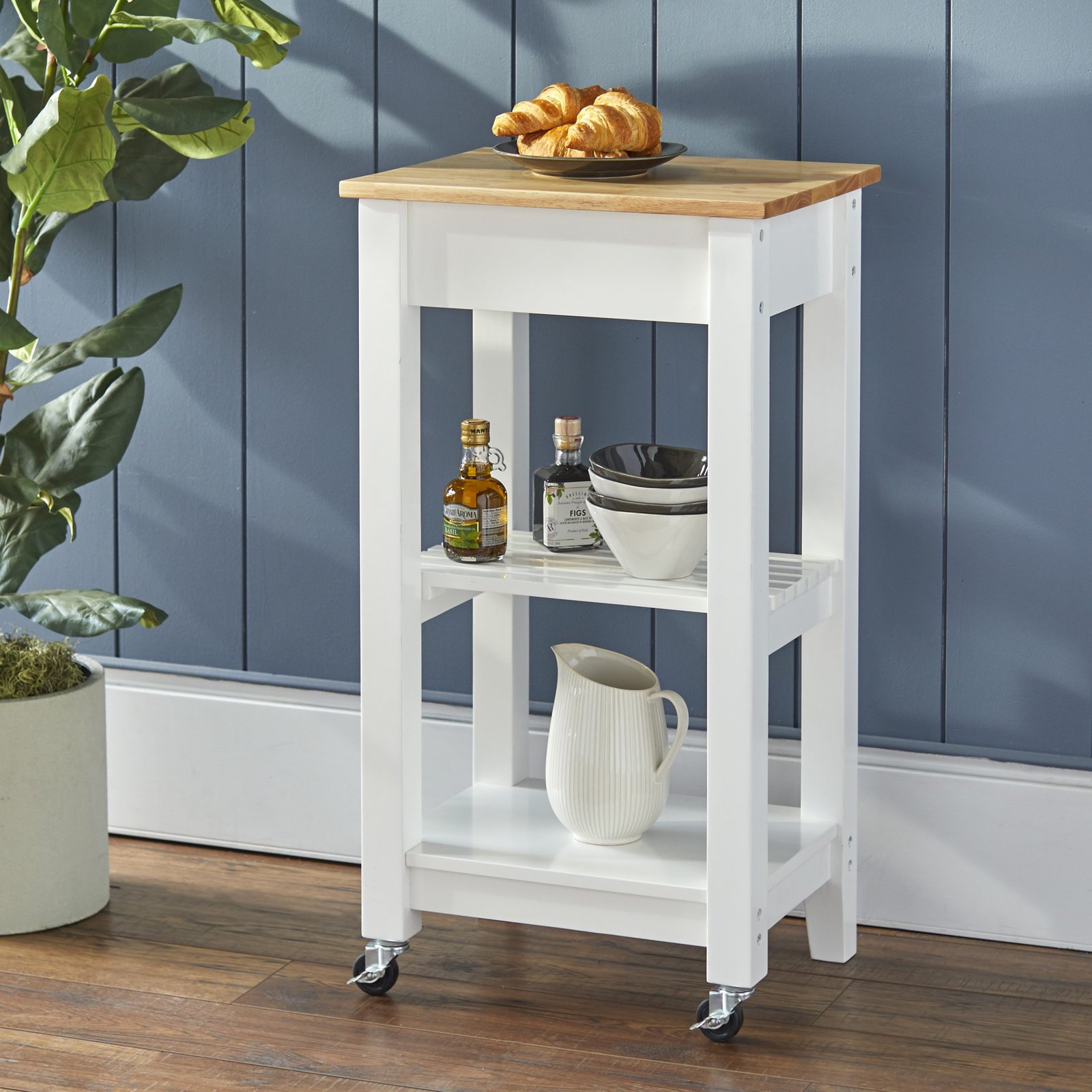 - Compact cart stores easily in a corner of the kitchen and can be wheeled out when needed