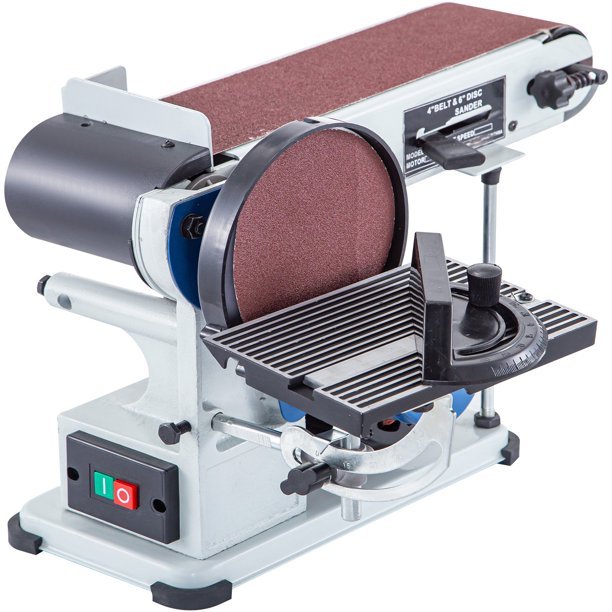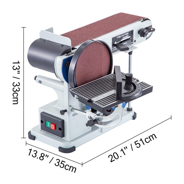 COMBINED BELTDISC SANDER – The bench belt sander is combined with a belt sander and a disc sander, making easy work of achieving a fine and smooth finish on component pieces. The belt sander features both horizontal and vertical sanding. The disc sanding tables can tilt 45 degrees. DURABLE STEEL CONSTRUCTION – The disc-and-belt sander is made of heavy-duty steel. It is durable and can be used for a long time. A strong base with rubberized pads provides extra stability, avoiding any heavy vibrations when you operate. EASY OPERATIONMOTOR 375W – This disc belt sander works well with a high-speed pure copper motor. This super-strong motor runs smoothly, and the energy consumption is low. Power: 375W. The safety switch is easy and safe to operate. CONSIDERABLE DETAILS – It is easy and quick for you to adjust and change the belt. The deluxe miter gauge makes your work more accurate. Besides, the metal belt sander is designed with two dust ports for dust-free operation.