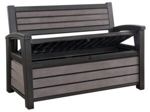 Compact and ultra long-lasting, the Keter Hudson Patio Bench adds convenient storage for outdoor gear, while doubling up as a handy patio loveseat. This patio bench holds up to 60 gallons of storage, so you can cram it full of yard tools, garden accessories, patio cushions or snow day necessities. Its patio bench provides comfortable seating along with convenient storage. Constructed of durable weather-resistant resin, it’s built to last. With Keter’s stay-dry design, it will keep your stored items safe and protected through rain or shine. This Keter Hudson Patio Storage Bench is decorative and functional and will look great in most backyards.