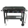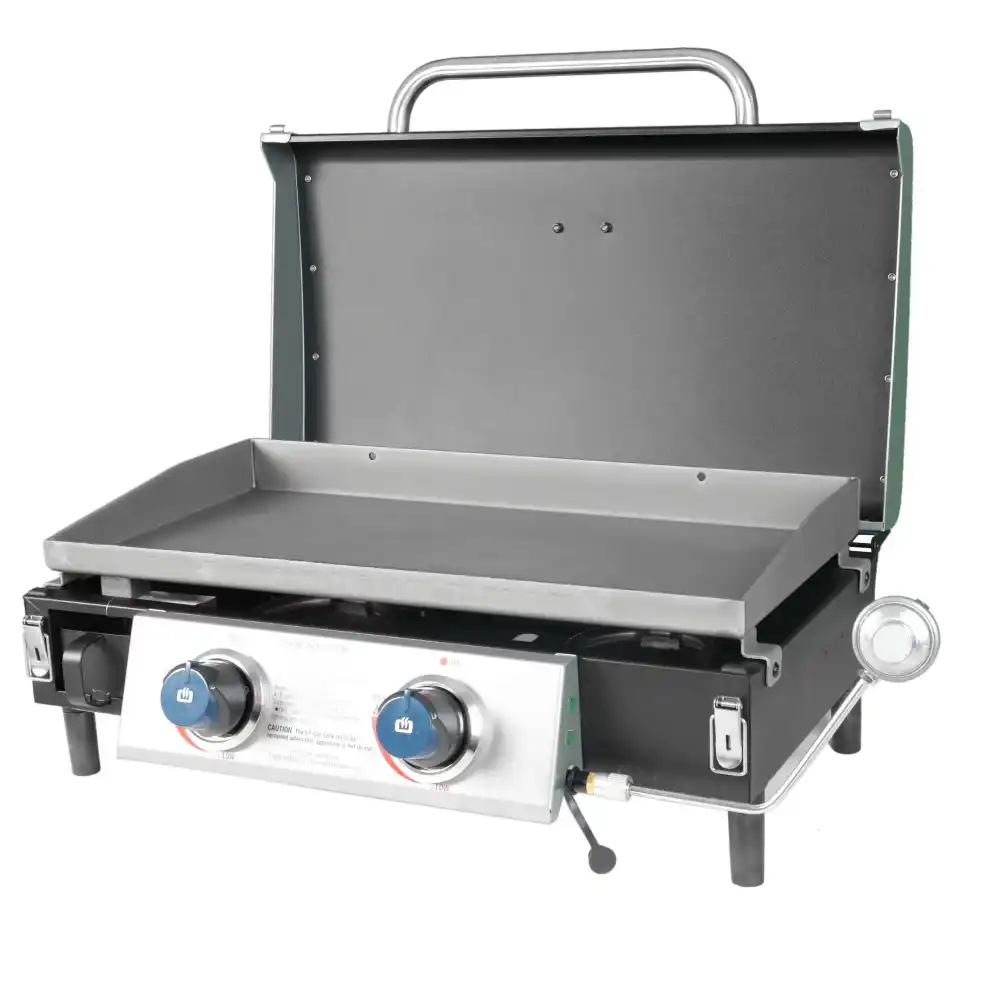 Make BBQ night every night of the summer with the Razor 25-Inch 2-Burner Portable Liquid Propane Gas Griddle. This gas grill features 2 stainless steel burners for a total of 20,000 BTU of power to keep you going. Set up this versatile, portable grill on a table and get to frying. For a simple startup and an easy light, fire up the grill with the push-and-turn ignition. You’ll have plenty of room to grill for everyone at your next backyard barbeque or weekend tailgate. With a 318 square inch cooking surface, whip up some burgers, eggs, and bacon, or make a stir fry to show off your skills. Use the steel lid to steam or melt foods. This handy lid also provides extra protection to use when cooking in unexpected weather. The mobile grill’s compact design makes transportation convenient if your grilling expertise is requested elsewhere. For the food grilling enthusiast, bring your friends and family together to spend days cooking out in the backyard with the 2-Burner Portable LP Gas Griddle by Razor.