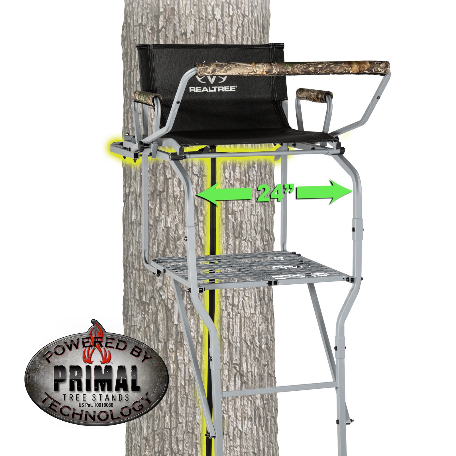 The new Realtree Deluxe Extra-Wide Single Person 15’ Ladder stand features the patented Primal Grip Jaw System, making this ladder stand rock solid before you ever leave the ground. The 24” extra wide, flip up textilene seat and camo padded flip-up shooting rail allows for all day hunting comfort. This ladder stand also features a 20″ wide ladder, giving the hunter the ability to easily ascend, descend, and change direct. The Realtree Deluxe Extra-Wide Single Person 15′ Ladder Stand is rated for up to 300 lbs. and has a weight of 68.3 lbs. A full body safety harness is included with this ladder stand.Realtree Xtra Wide Single Person Hunting Ladder Stand