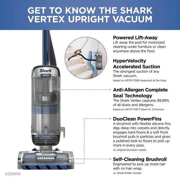 The Shark Vertex Powered Lift-Away delivers the most suction of any Shark vacuum* and features DuoClean PowerFins, a two-brushroll, no-bristle system to deep-clean with nonstop contact and eliminate hair wrap. *ASTM F558, measured at the hose
