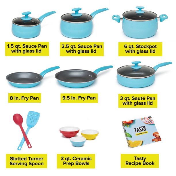 - Set Includes: 8 inch fry pan, 9.5 inch fry pan, 1.5 quart saucepan with glass lid, 2.5 quart saucepan with glass lid, 3 quart sauté pan with glass lid, 6 quart stockpot with glass lid, slotted turner, serving spoon with measuring marks, 3 ceramic bowls (2 ounce, 4 ounce and 6 ounce), recipe booklet