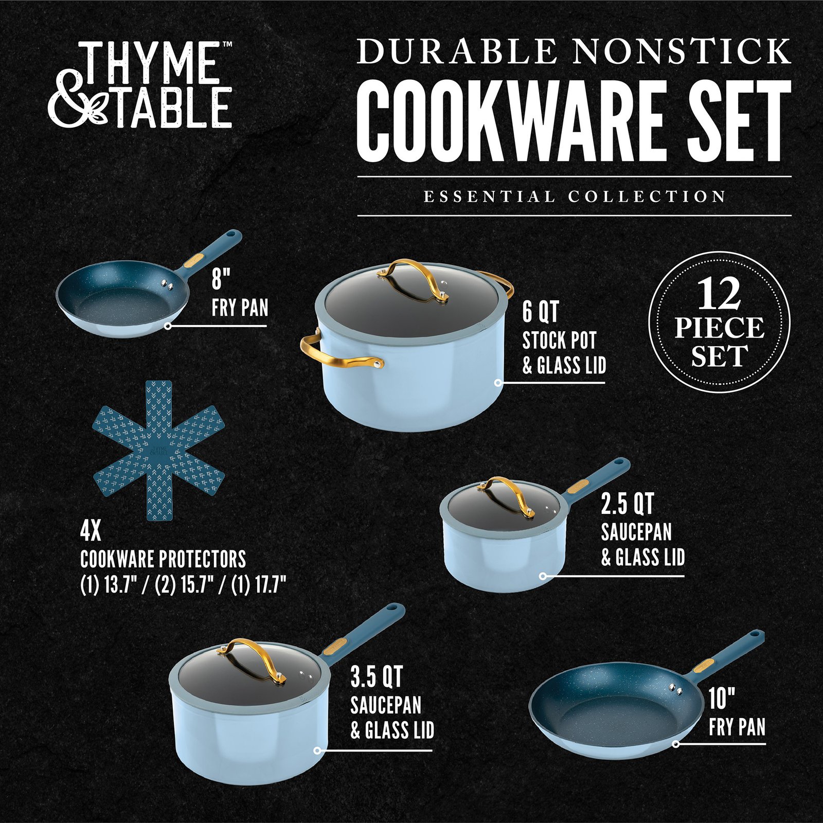 Thyme & Table Non-Stick 12-Piece Cookware Set, Blue