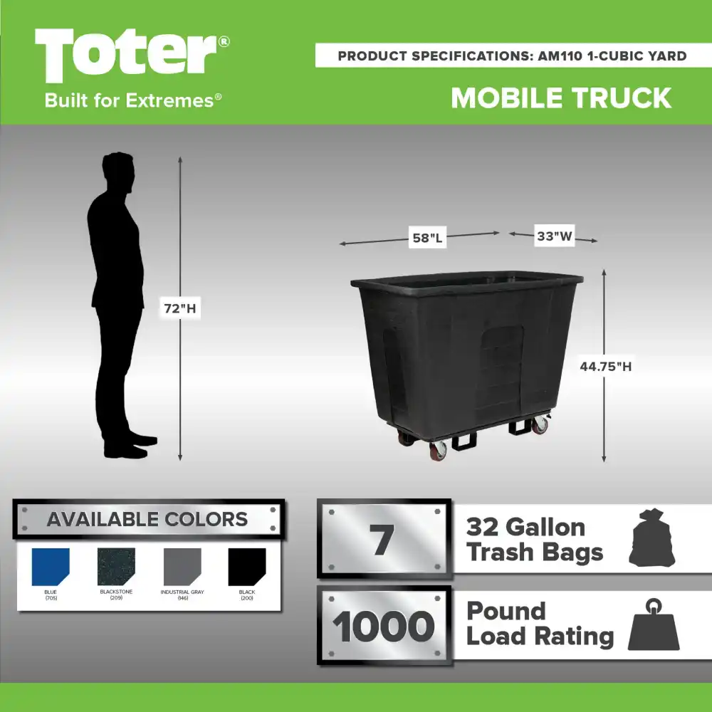 - 1 Cubic Yard Universal Mobile Truck can handle up to 1,000 lbs. of waste and other materials