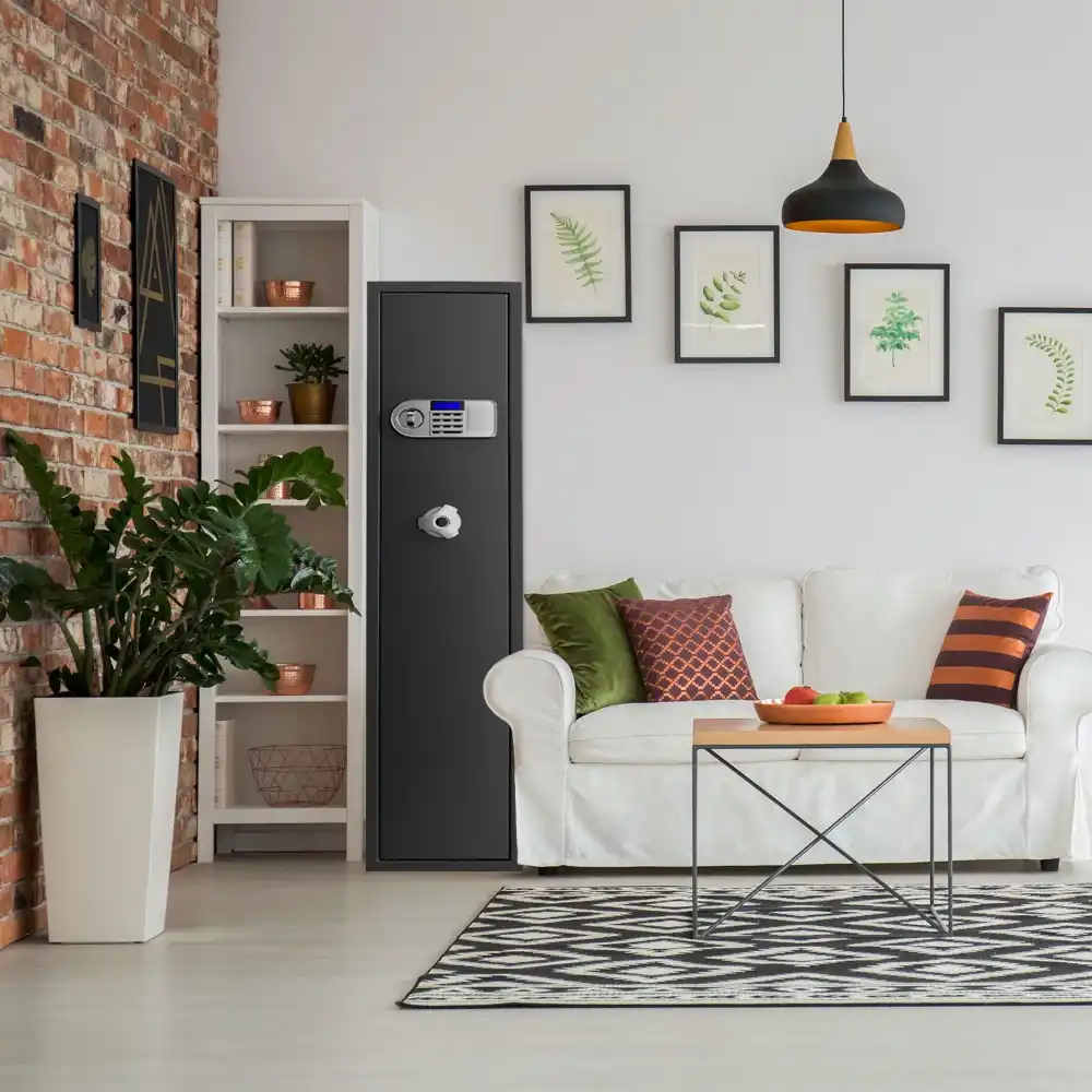 The rifle gun safe is made of cold rolled steel. anti-theft and anti-pry design. Features 60mm guage thick door and 3x20mm in diameter locking deadbolts add security. Ensuring that no one can open the gun cabinet without a combination or key. The sturdy construction ensures that guns are kept away from children and prevents theft.