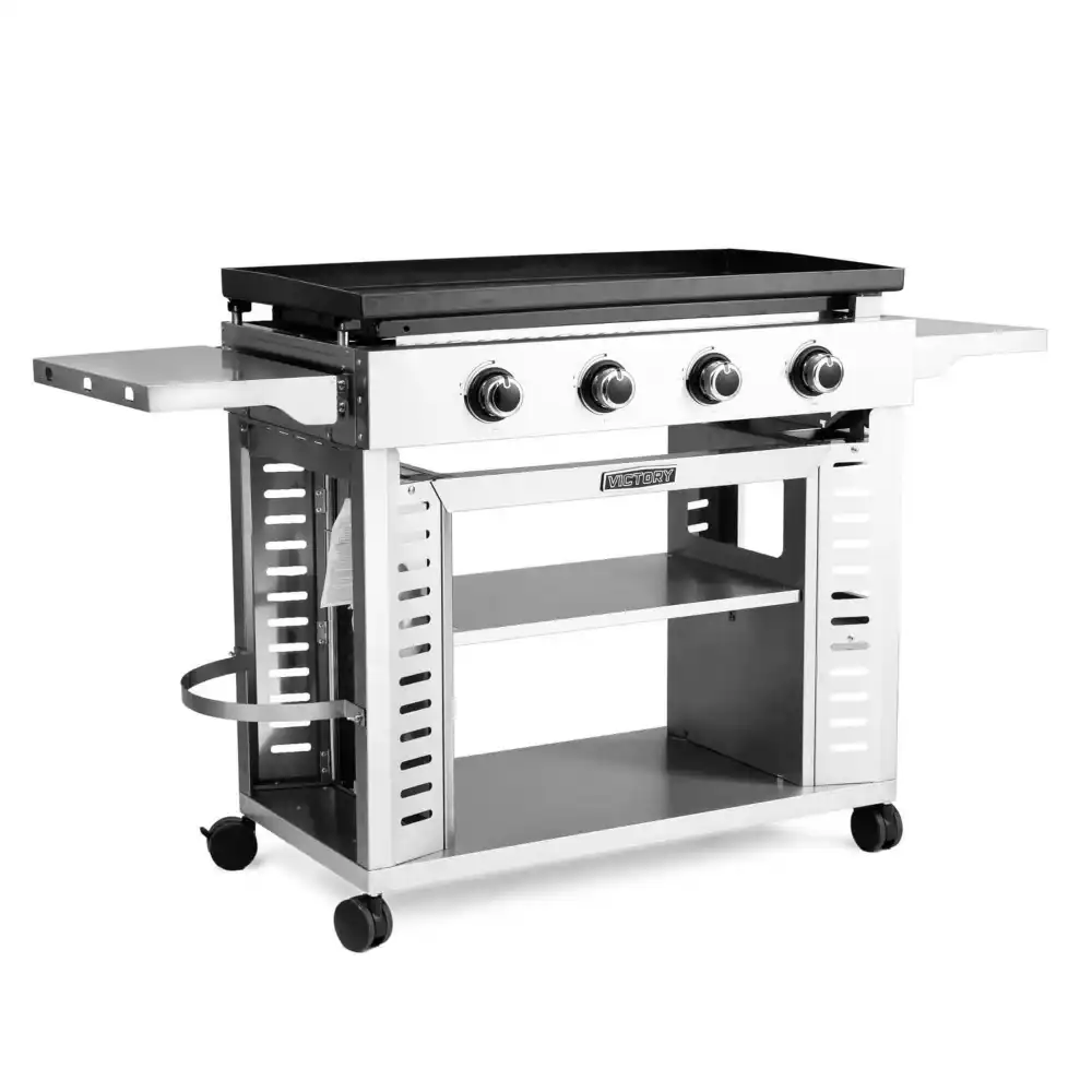 Victory 36-Inch 4-Burner Propane Gas Griddle – VCT-G4B-LP. VCT-G4B-LP. Flat Top Grills & Gas Griddles. BBQGuys Exclusive! Are you ready to Taste Victory? With lasting materials and unmatched quality among its peers, the Victory propane gas griddle beats the competition to help you cook a breakfast, lunch, or dinner of champions—and mean it, too! Full-Featured Griddle at an Affordable Price The griddle body is all stainless steel, and the 7-gauge steel cooking surface offers 665 square inches of cooking space. The cooking surface’s porcelain coating has been specially formulated to resist chips and scratches, so you don’t have to worry about rust or needing to keep the surface seasoned. In the front right corner, there’s a large opening to drain grease and fat into the removable grease tray below. This opening is big enough drain even the biggest chunks of fat and grease without getting clogged, making cleanup incredibly simple. 4 Burners & Reliable Ignition Each burner in this gas griddle packs 12,000 BTUs, plenty of power to reach searing temperatures over 700 degrees Fahrenheit. Battery-free piezo ignitors reliably light each burner. Ample Prep Space & Plenty of Cart Storage Two side shelves offer convenient prep space while you cook and fold down for easier storage when the griddle is not in use. The left shelf includes 3 tool hooks, while the right shelf has rail for holding spatulas and knives. The Victory griddle’s cart features 2 large middle shelves, 2 shelves in the right end cap, a propane tank holder on the left end cap, and heavy-duty locking casters for mobility and stability. With all this to offer, the Victory gas griddle is the clear winner among its peers and the top choice for those who want to Taste Victory. Non-stick Porcelain Coated Cooking Surface 36 Inch porcelain coated cooking surface means no need to worry about rust. Two Foldable Side Shelves Two foldable side shelves provide plenty of prep space, and the cart shelves provide plen…