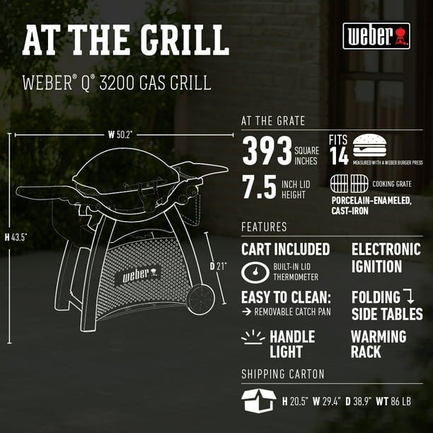 Enjoy tasty meats and veggies with the Weber Q3200 2-Burner Propane Gas Grill. This compact cooking companion packs a powerful punch. It comes with 21,700 BTU-per-hour input burners for even cooking. This Weber gas grill also features porcelain-enameled, cast-iron grates over a generous cooking area. It comes with a built-in thermometer, a warming rack and a removable catch pan. The 2-burner gas grill comes on a heavy-duty cart with three integrated tool hooks. The grill’s electronic ignition lets you fire it up quickly and easily. Small enough to fit on a balcony, but large enough to execute an entire meal.