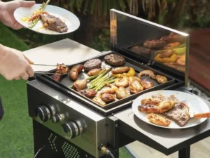 MF Studio 2-Burner Propane Grill and Griddle Cooking Station with Side Shelves Black