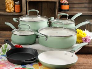 The Pioneer Woman Classic Belly 10 Piece Ceramic Non-stick and Cast Iron Cookware Set, Mint