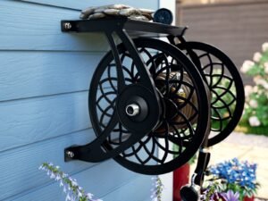 Suncast 125 ft. Slide Trak Decorative Metal Wall Mount Garden Hose Reel with Shelf, Black